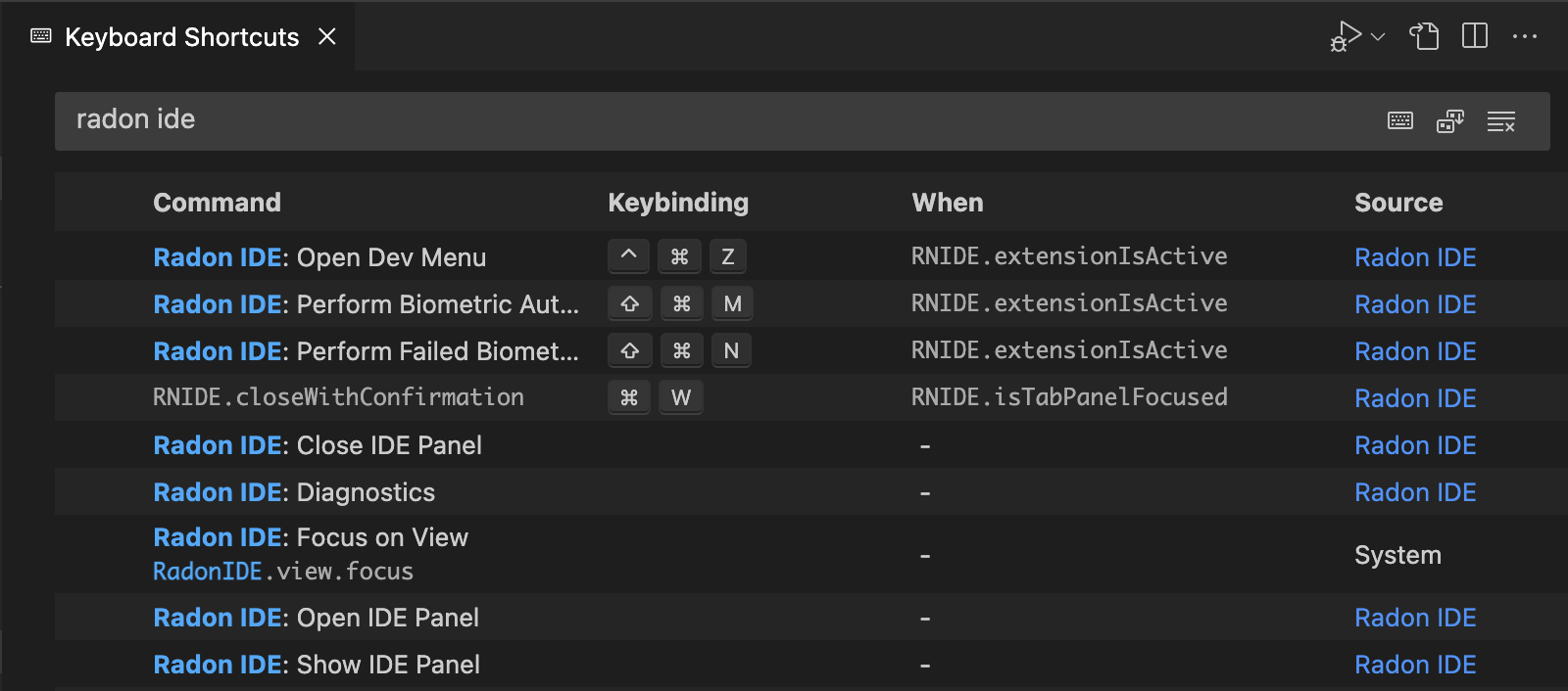 You can adjust the Radon IDE bindings in the VSCode keyboard shortcut editor.